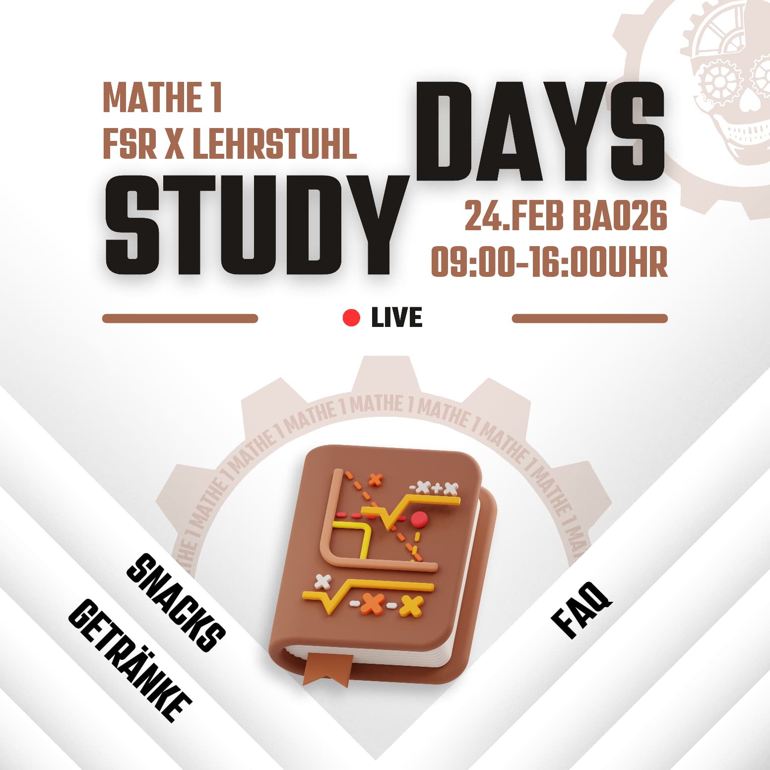 Am 24.02.2026 findet der StudyDay zur Mathematik 1 Klausur statt. Von 9:00 - 16:00 Uhr beantworte ich im BA 026 alle Ihre Fragen und rechne Aufgaben vor. Wenn Sie wünsche haben, welche Aufgaben (zB von den Altklausuren) vorgerechnet werden sollen, dann schreiben Sie mir die sehr(!) gerne vorab per Mail. Wir sehen uns am 24.02.!